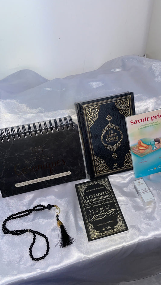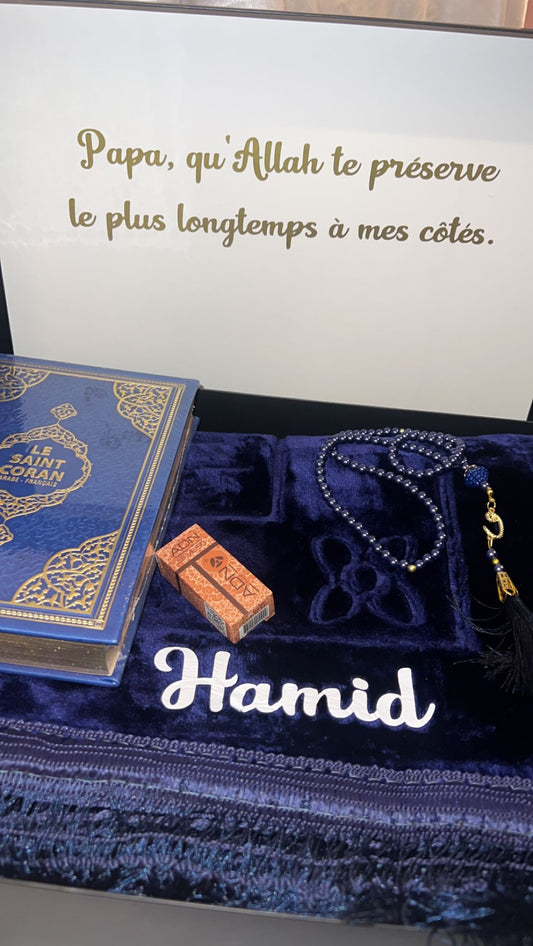 Le coffret MUSLIM est composé d’un tapis de prière personnalisé, d’un coran d’un chapelet, d’un musc et d’une citadelle du musulman et d’une boite coffret.
